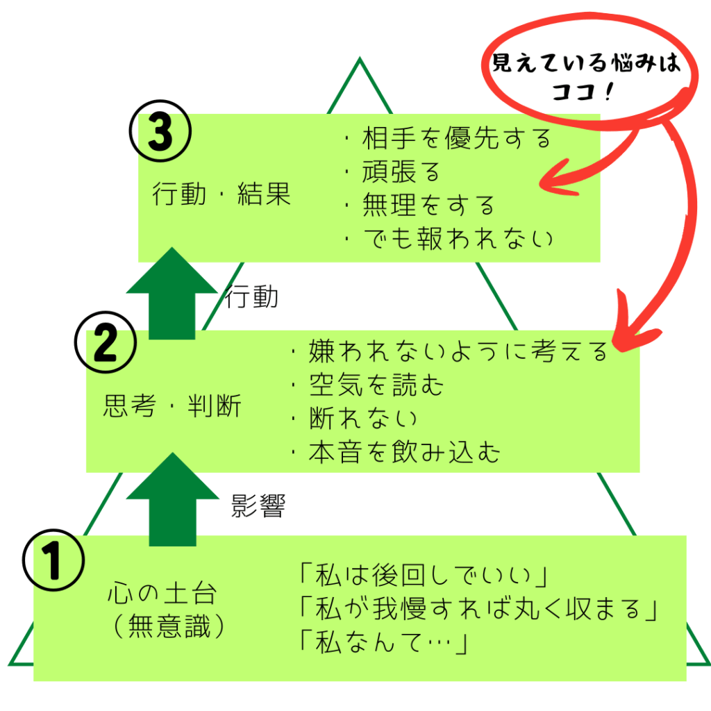 ── 問題は性格ではなく【自己否定が前提になった心の構造】です
